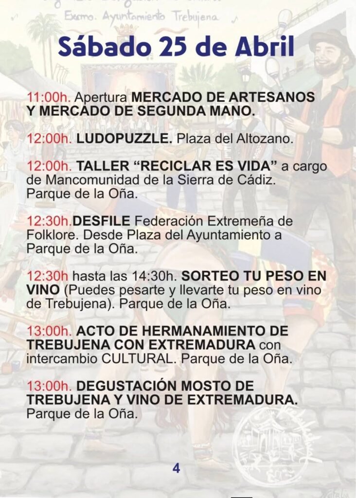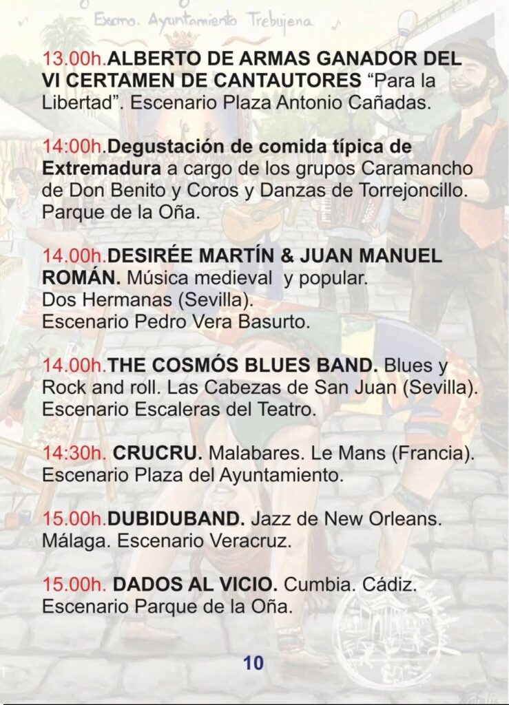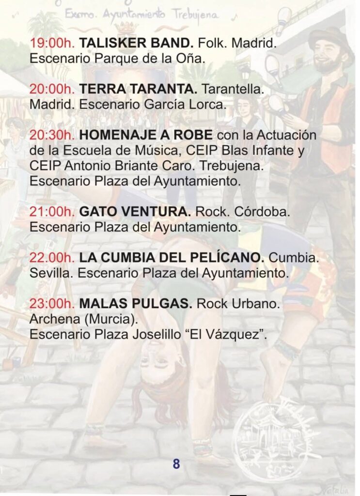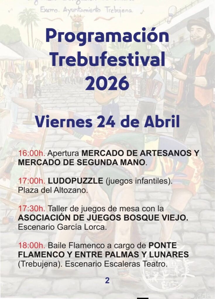 El viernes 24 arranca la actividad con la apertura del Mercado de Artesanos a las 16:00h. El sábado 25 viviremos el momento más emotivo con el Homenaje a Robe e Iniesta, un tributo legendario que une las raíces de Extremadura con el espíritu de Trebujena. Finalmente, el domingo 26 se celebrará el Certamen de Música Callejera y el gran fin de fiesta con el concierto de Amparanoia a las 20:00h en la Plaza del Ayuntamiento.